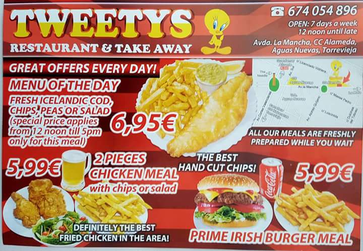 Welcome to Tweetys Fish And Chips, an inviting gem nestled in Torrevieja, Alicante. This fast food restaurant is renowned for its exceptional take on classic fish and chips, particularly the meticulously prepared haddock and cod, celebrated for their freshness and flavor.